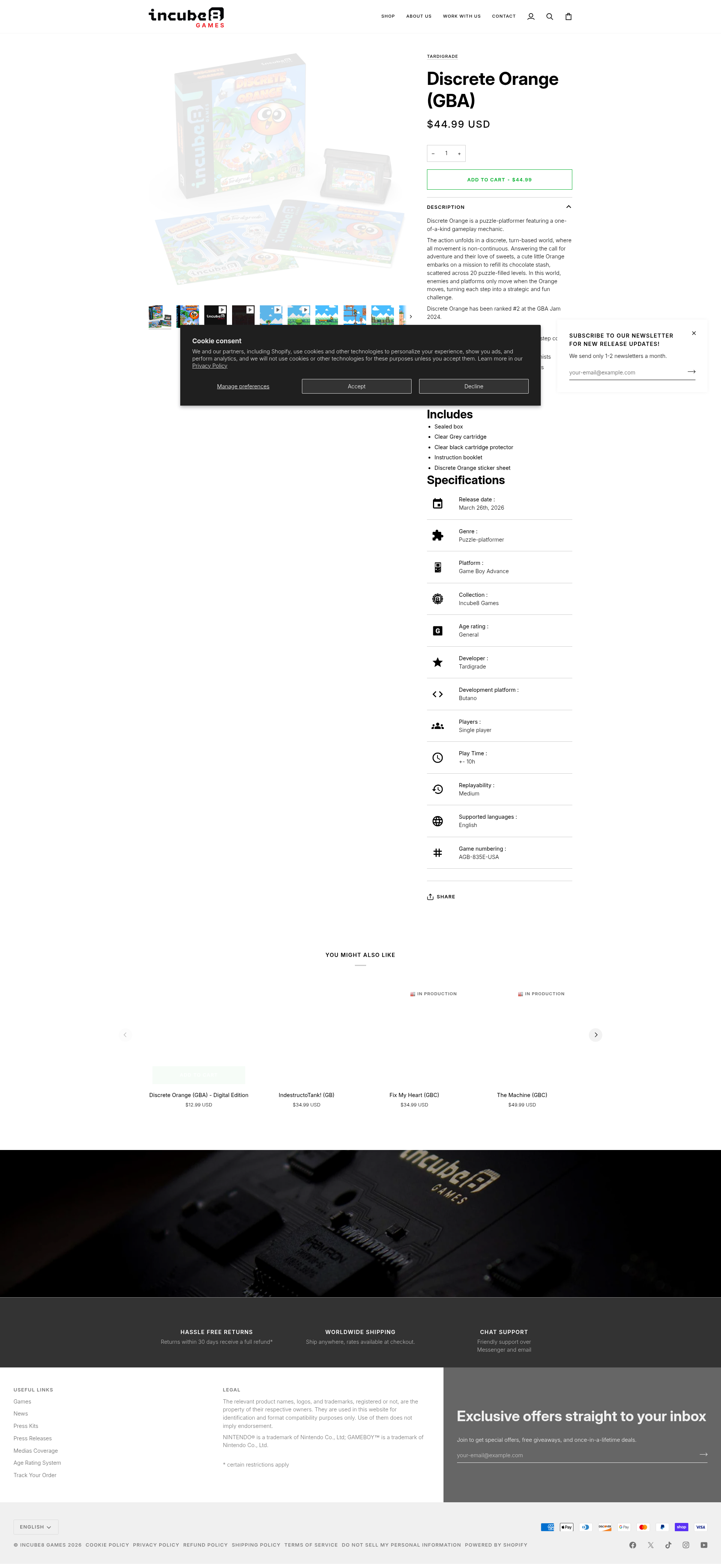 Discrete Orange (GBA)Discrete Orange is a puzzle-platformer featuring a one-of-a-kind gameplay mechanic. The action unfolds in a discrete, turn-based world, where all movement is non-continuous. Answering the call for adventure and their love of sweets, a cute little Orange embarks on a mission to refill its chocolate stash, scattered acroPNGPDF