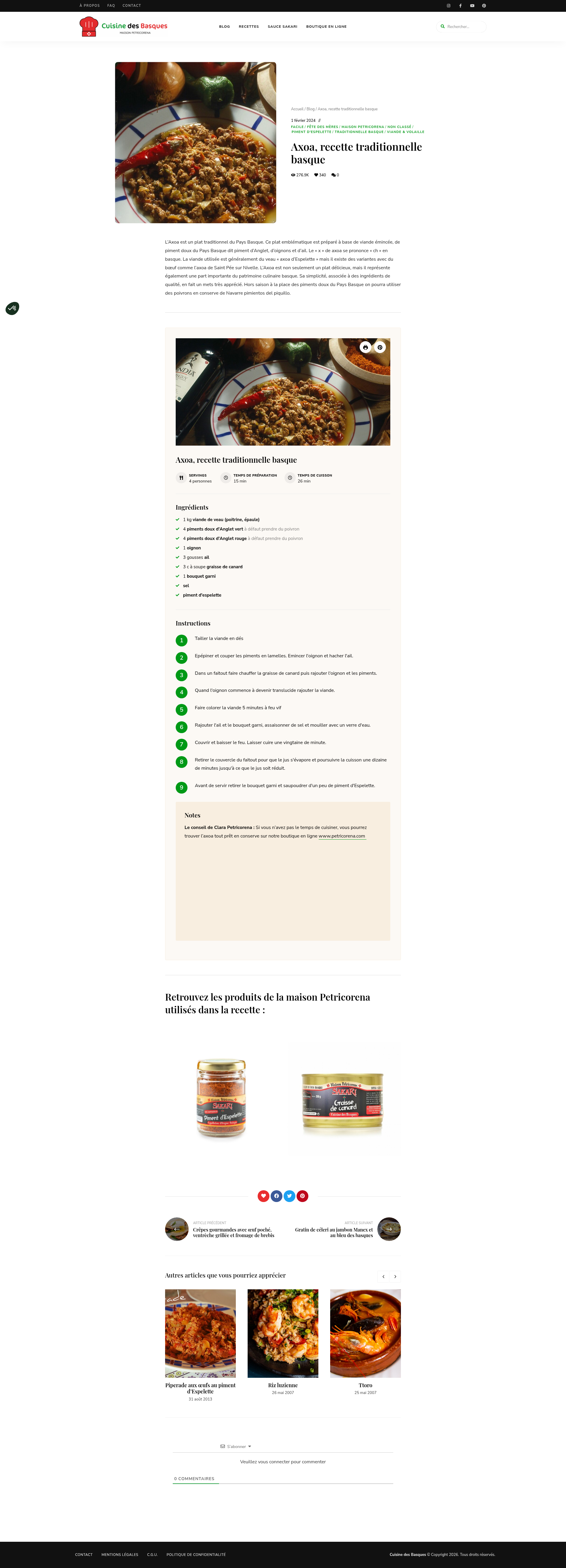 Axoa, recette traditionnelle basque - Cuisine des BasquesL'Axoa est un plat traditionnel Basque à base de viande émincée, de piment doux du Pays Basque dit piment d'Anglet, d'oignons et d'ail.PNGPDF
