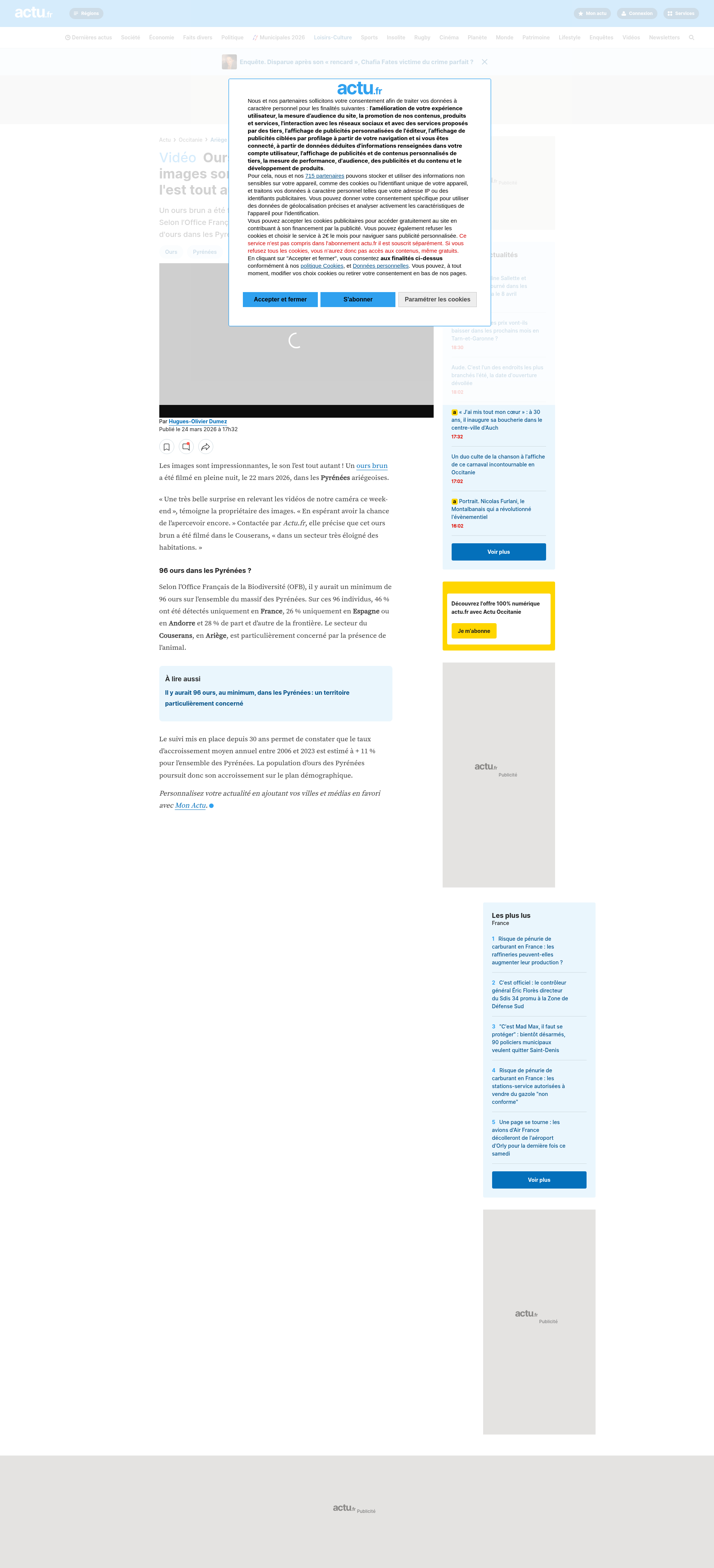 Vidéo. Ours brun dans les Pyrénées : les images sont impressionnantes, le son l'est tout autant !Un ours brun a été filmé en pleine nuit, le 22 mars 2026, dans le Couserans. Selon l’Office Français de la Biodiversité, il y aurait près d'une centaine d'ours dans les Pyrénées.PNGPDF