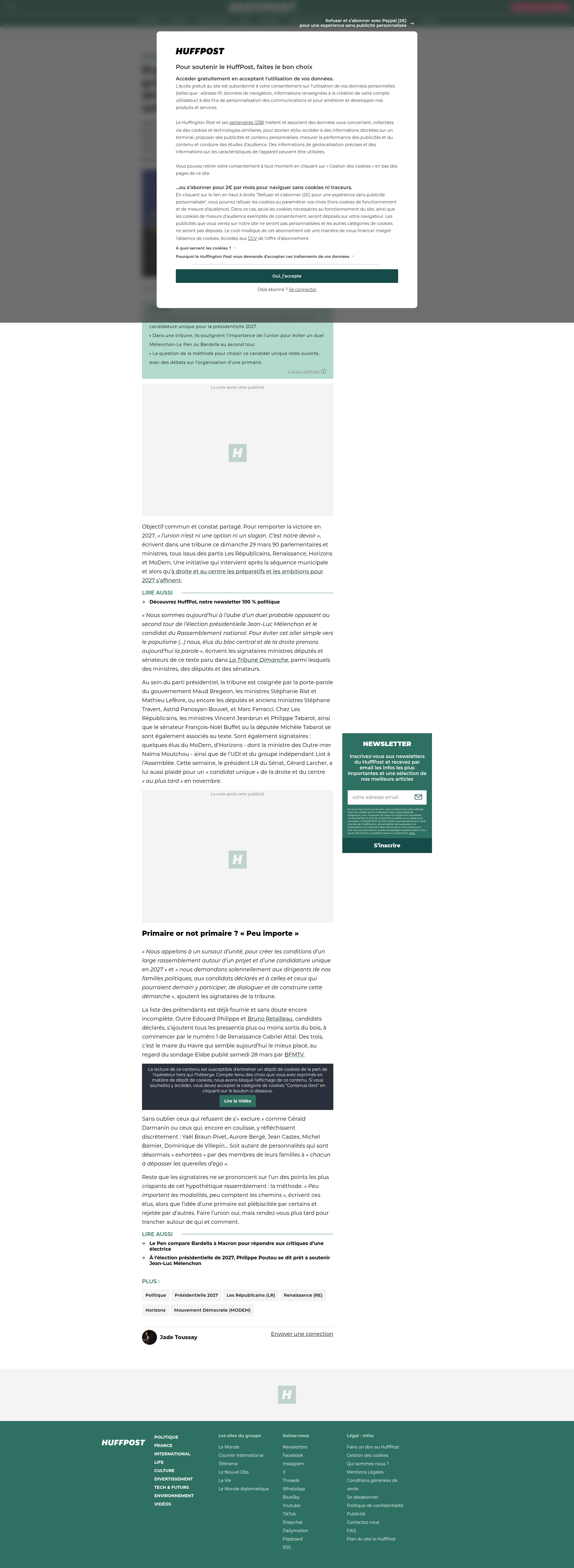 Près de 100 personnalités de droite et du centre réclament une candidature unique en 2027Ministres et parlementaires LR, MoDem, Horizons et Renaissance exhortent leurs chefs de partis à s’unir. Autour de qui et comment ? La question n’est pas tranchée.PNGPDF