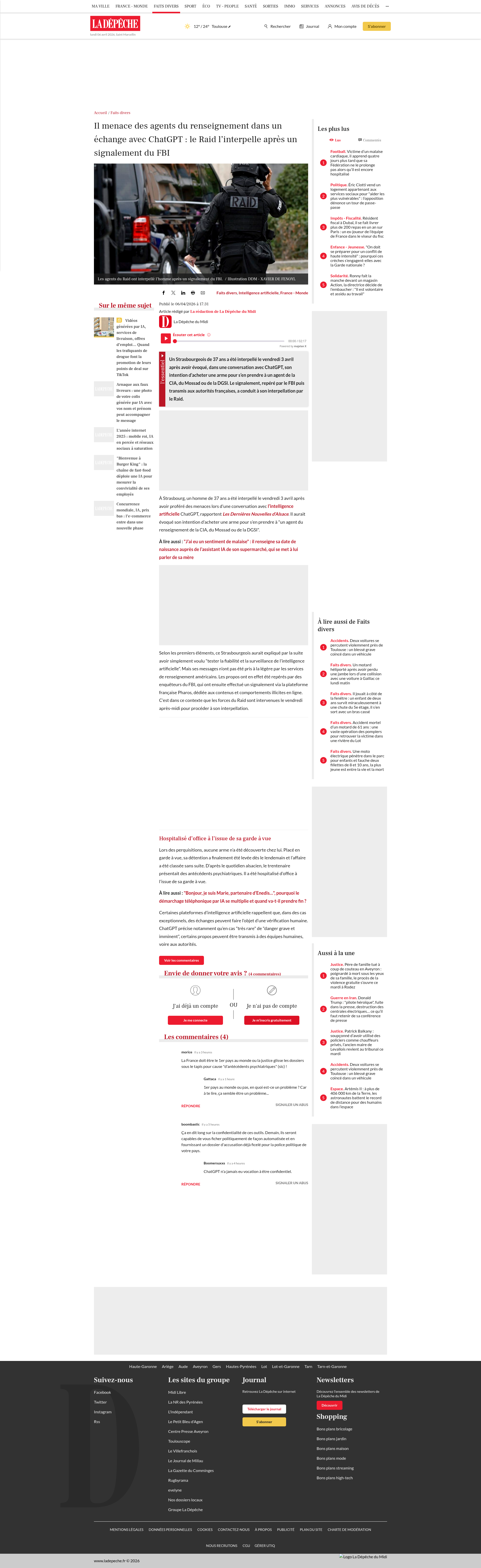 Bas-Rhin. Il évoque le meurtre d'un agent du renseignement à l'IA : le FBI alerte, le Raid intervientUn homme qui avait évoqué son intention de « tuer un agent du renseignement » dans une conversation avec une intelligence artificielle a été arrêté vendredi à Strasbourg, révèlent Les Dernières Nouvelles d'Alsace.PNGPDF