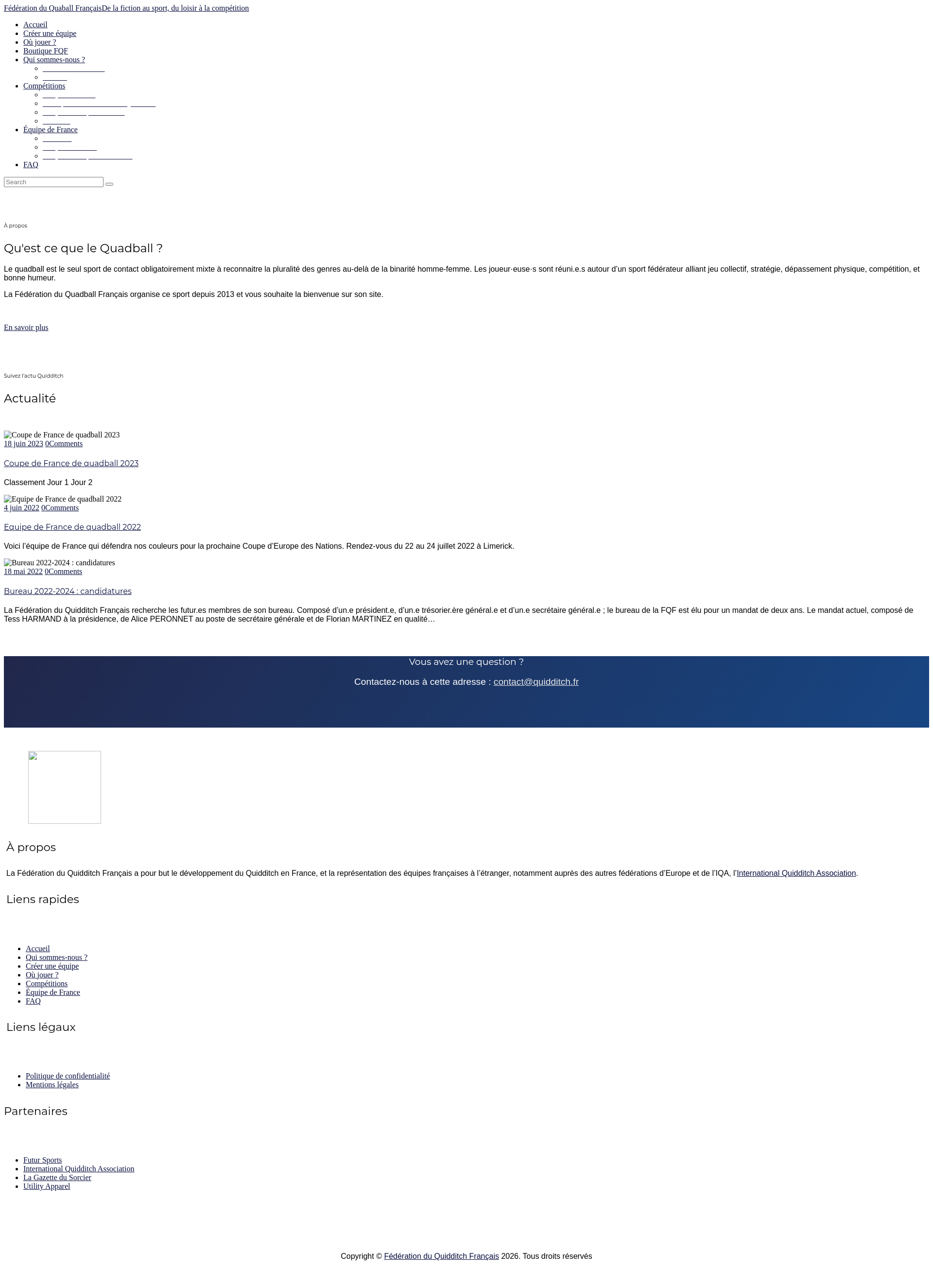 Accueil | Fédération du Quadball FrançaisLa Fédération du Quadball Français organise ce sport depuis 2013 et vous souhaite la bienvenue sur son site.PNGPDF