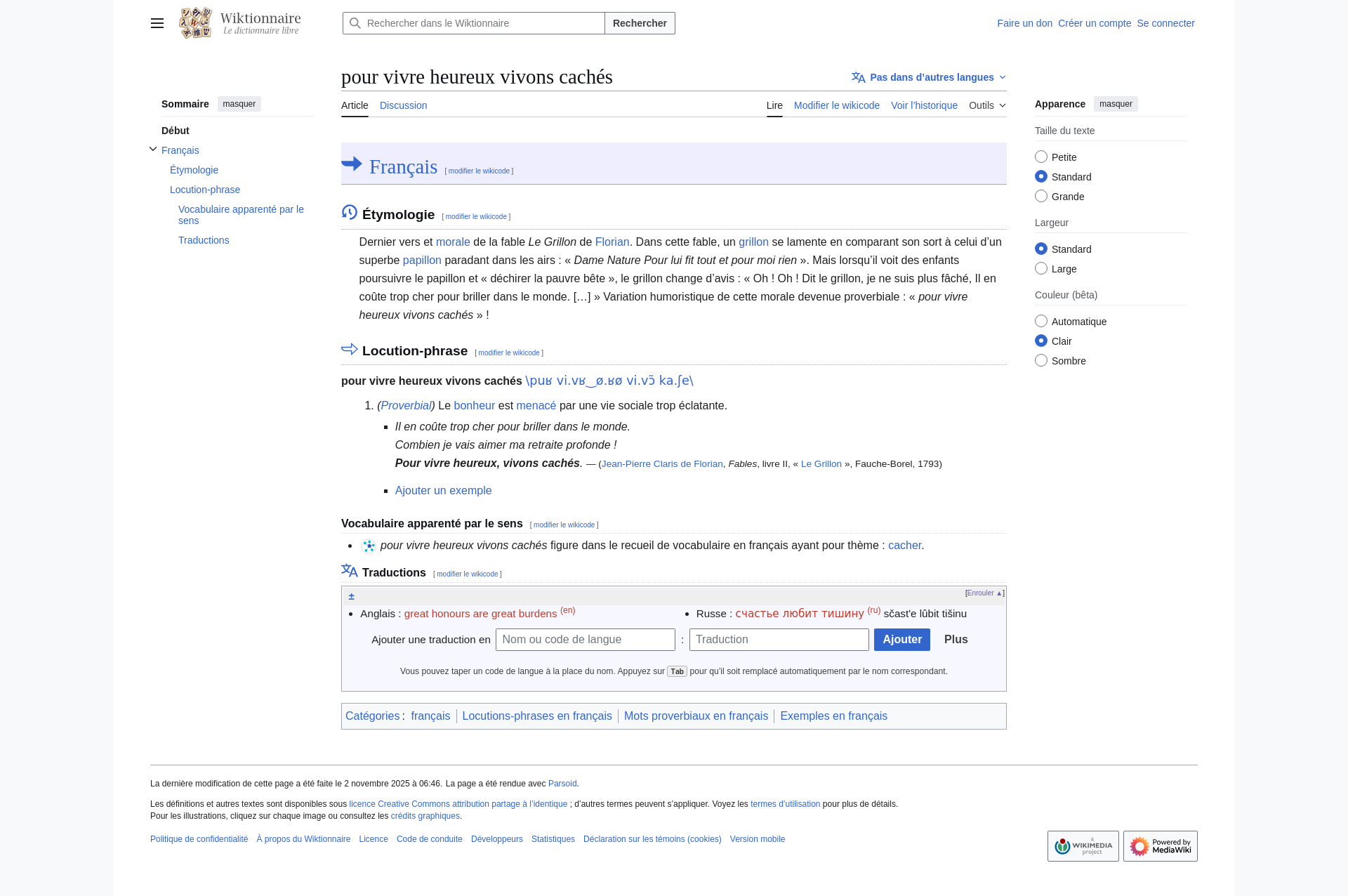 pour vivre heureux vivons cachés — Wiktionnaire, le dictionnaire librePNGPDF
