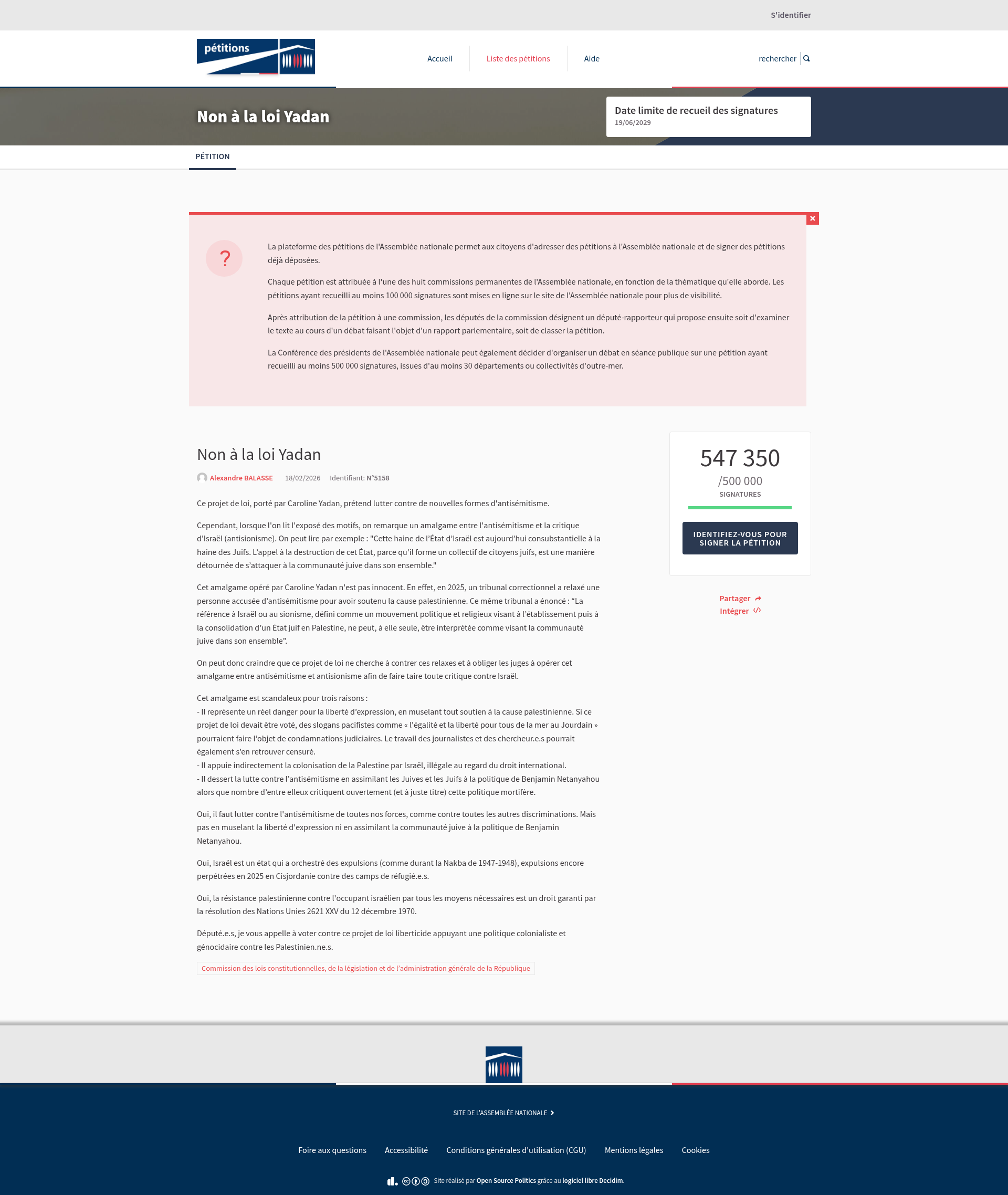 Non à la loi Yadan - Non à la loi Yadan - Plateforme des pétitions de l’Assemblée nationaleCe projet de loi, porté par Caroline Yadan, prétend lutter contre de nouvelles formes d'antisémitisme. Cependant, lorsque l'on lit l'exposé des motifs, on remarque un amalgame entre l'antisémitisme et la critique d'Israël (antisionisme). On peut lire par exemple : "Cette haine de l’État d’Israël est aujourd’hui consubstantielle à la haine des Juifs. L’appel à la destruction de cet État, parce qu’il forme un collectif de citoyens juifs, est une manière détournée de s’attaquer à la communauté juive dans son ensemble." Cet amalgame opéré par Caroline Yadan n'est pas innocent. En effet, en 2025, un tribunal correctionnel a relaxé une personne accusée d’antisémitisme pour avoir soutenu la cause palestinienne. Ce même tribunal a énoncé : “La référence à Israël ou au sionisme, défini comme un mouvement politique et religieux visant à l’établissement puis à la consolidation d’un État juif en Palestine, ne peut, à elle seule, être interprétée comme visant la communauté juive dans son ensemble”. On peut donc craindre que ce projet de loi ne cherche à contrer ces relaxes et à obliger les juges à opérer cet amalgame entre antisémitisme et antisionisme afin de faire taire toute critique contre Israël. Cet amalgame est scandaleux pour trois raisons : - Il représente un réel danger pour la liberté d’expression, en muselant tout soutien à la cause palestinienne. Si ce projet de loi devait être voté, des slogans pacifistes comme « l'égalité et la liberté pour tous de la mer au Jourdain » pourraient faire l’objet de condamnations judiciaires. Le travail des journalistes et des chercheur.e.s pourrait également s’en retrouver censuré. - Il appuie indirectement la colonisation de la Palestine par Israël, illégale au regard du droit international. - Il dessert la lutte contre l’antisémitisme en assimilant les Juives et les Juifs à la politique de Benjamin Netanyahou alors que nombre d’entre elleux critiquent ouvertement (et à juste titre) cette politique mortifère. Oui, il faut lutter contre l'antisémitisme de toutePNGPDF