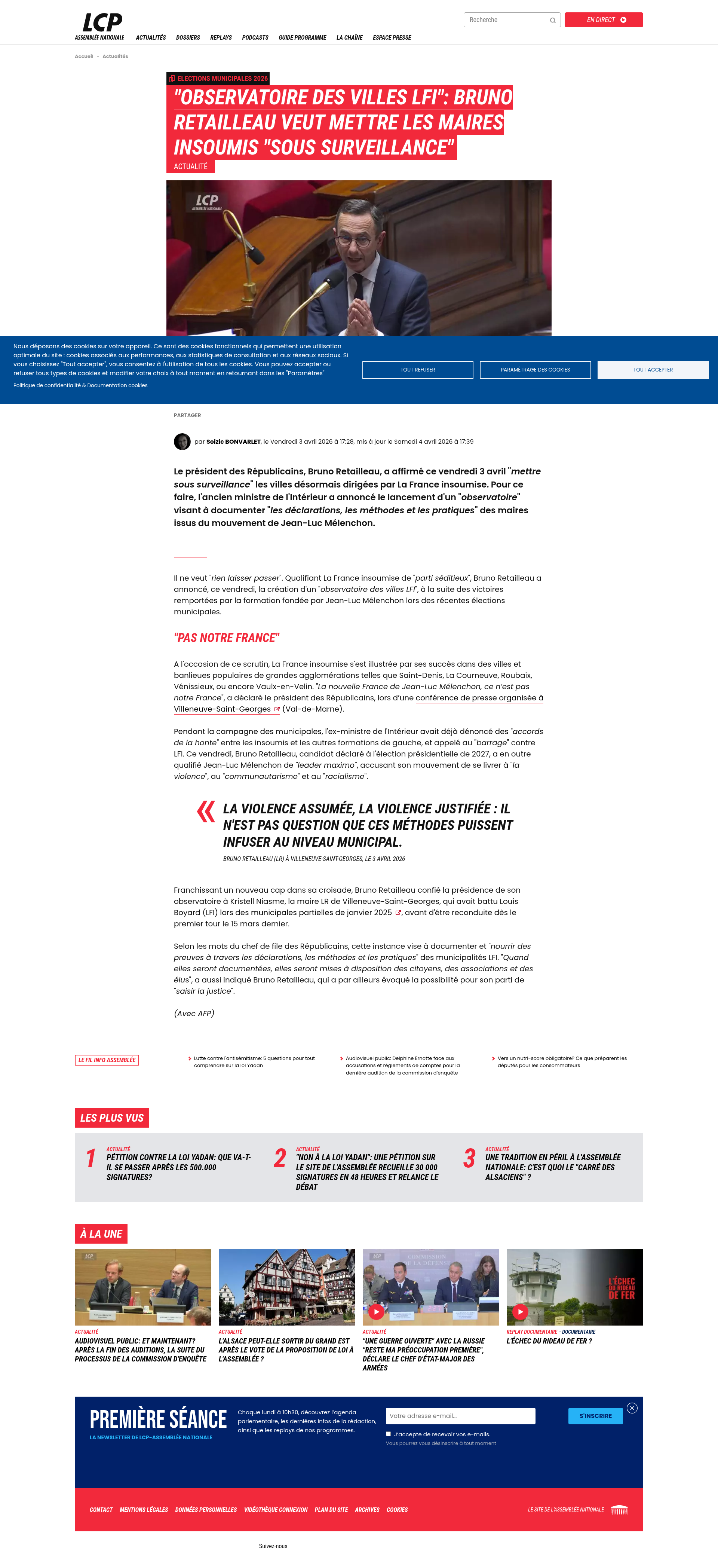 "Observatoire des villes LFI": Bruno Retailleau veut mettre les maires insoumis "sous surveillance" | LCP - Assemblée nationaleLe président des Républicains, Bruno Retailleau, a affirmé ce vendredi 3 avril "mettre sous surveillance" les villes désormais dirigées par La France insoumise. Pour ce faire, l'ancien ministre de l'Intérieur a annoncé le lancement d'un "observatoire" visant à documenter "les déclarations, les méthodes et les pratiques" des maires issus du mouvement de Jean-Luc Mélenchon. PNGPDF