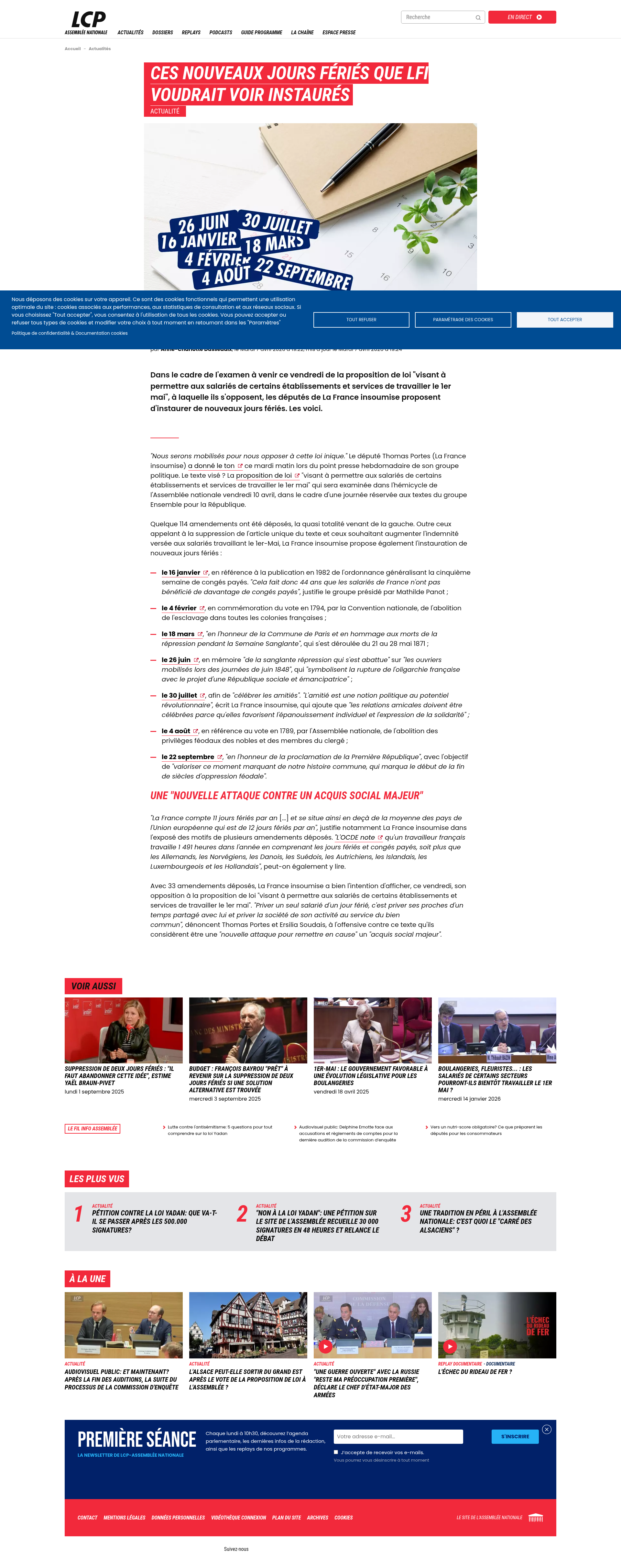 Ces nouveaux jours fériés que LFI voudrait voir instaurés | LCP - Assemblée nationaleDans le cadre de l'examen à venir ce vendredi de la proposition de loi "visant à permettre aux salariés de certains établissements et services de travailler le 1er mai", à laquelle ils s'opposent, les députés de La France insoumise proposent d'instaurer de nouveaux jours fériés. Les voici.PNGPDF