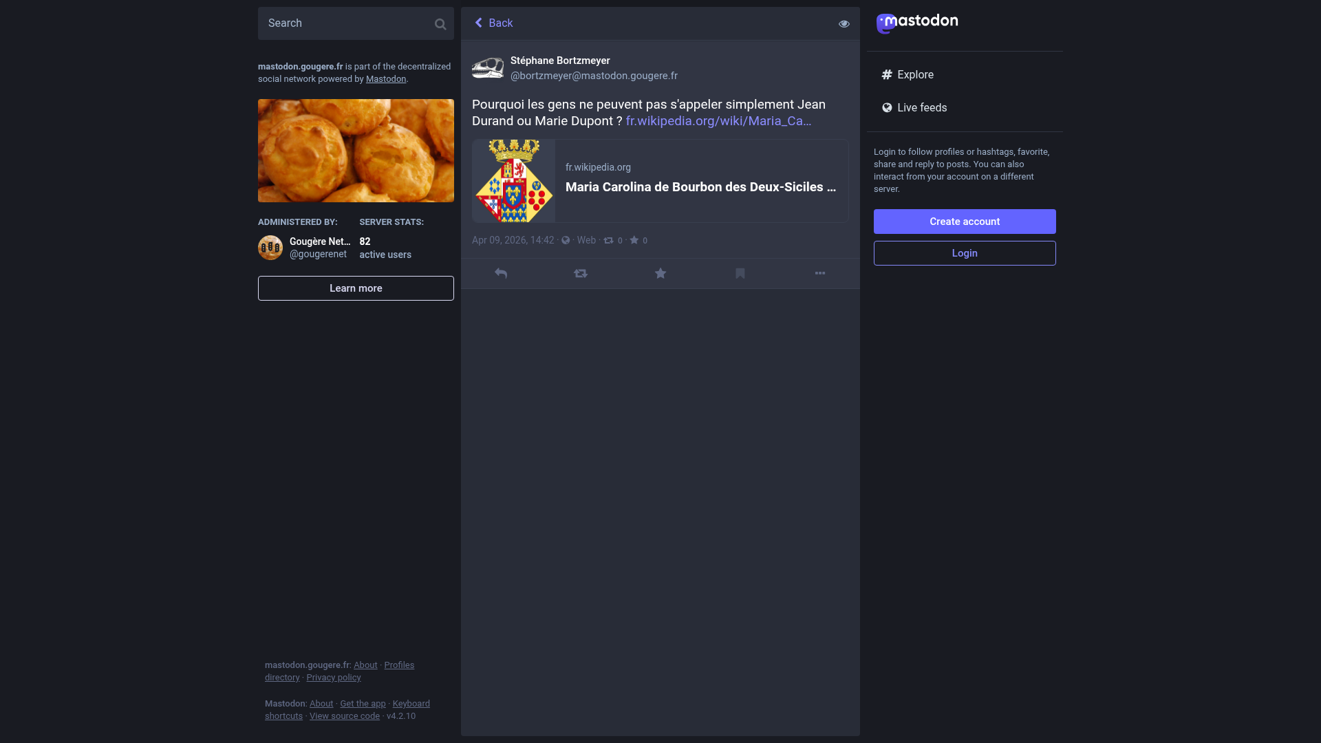 Stéphane Bortzmeyer (@bortzmeyer@mastodon.gougere.fr)Pourquoi les gens ne peuvent pas s'appeler simplement Jean Durand ou Marie Dupont ? https://fr.wikipedia.org/wiki/Maria_Carolina_de_Bourbon_des_Deux-Siciles#Vie_priv%C3%A9ePNGPDF