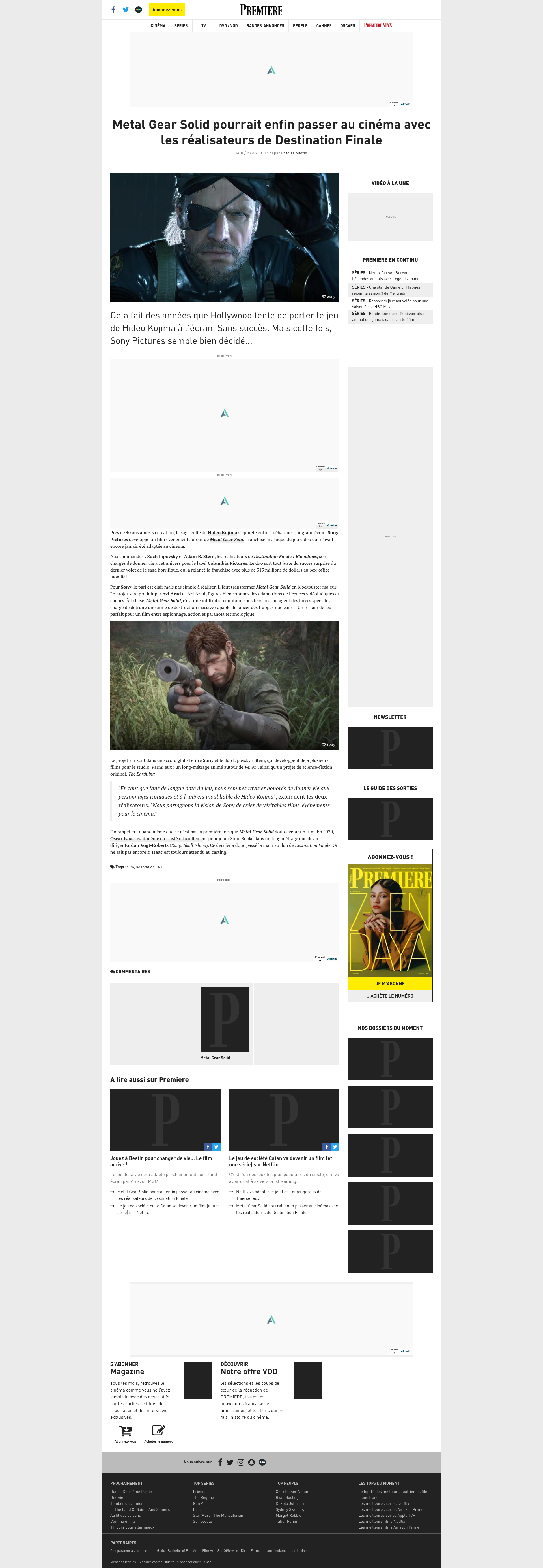 Metal Gear Solid pourrait enfin passer au cinéma avec les réalisateurs de Destination FinaleCela fait des années que Hollywood tente de porter le jeu de Hideo Kojima à l'écran. Sans succès. Mais cette fois, Sony Pictures semble bien décidé...PNGPDF