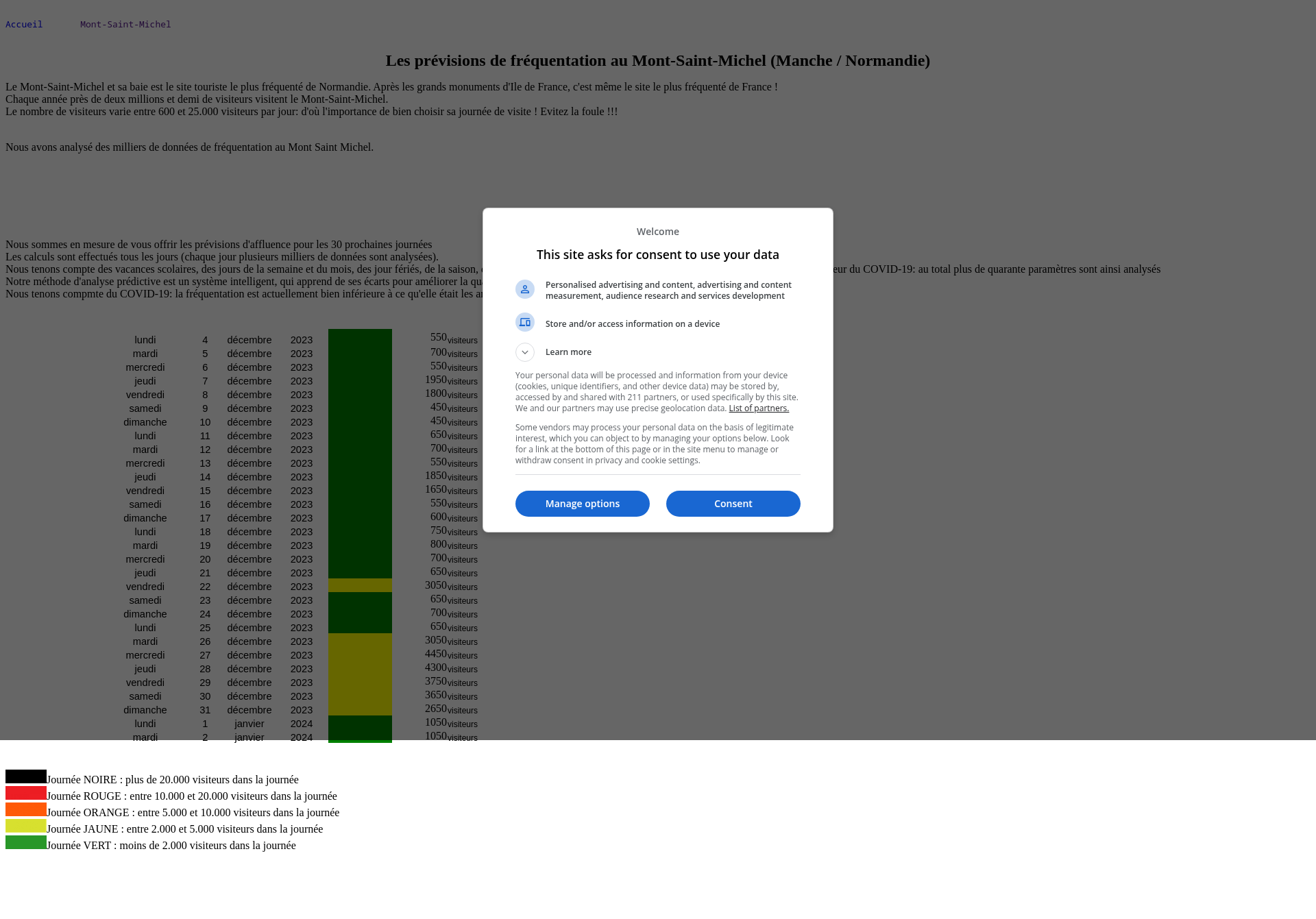 Mont Saint Michel: prévisions de fréquentationLes prévisions d'affluence pour les prochains jours au Mont-Saint-Michel. Quel jour et quelle période aller au mont saint michel ? Choisissez la bonne journée pour éviter la foulePNGPDF
