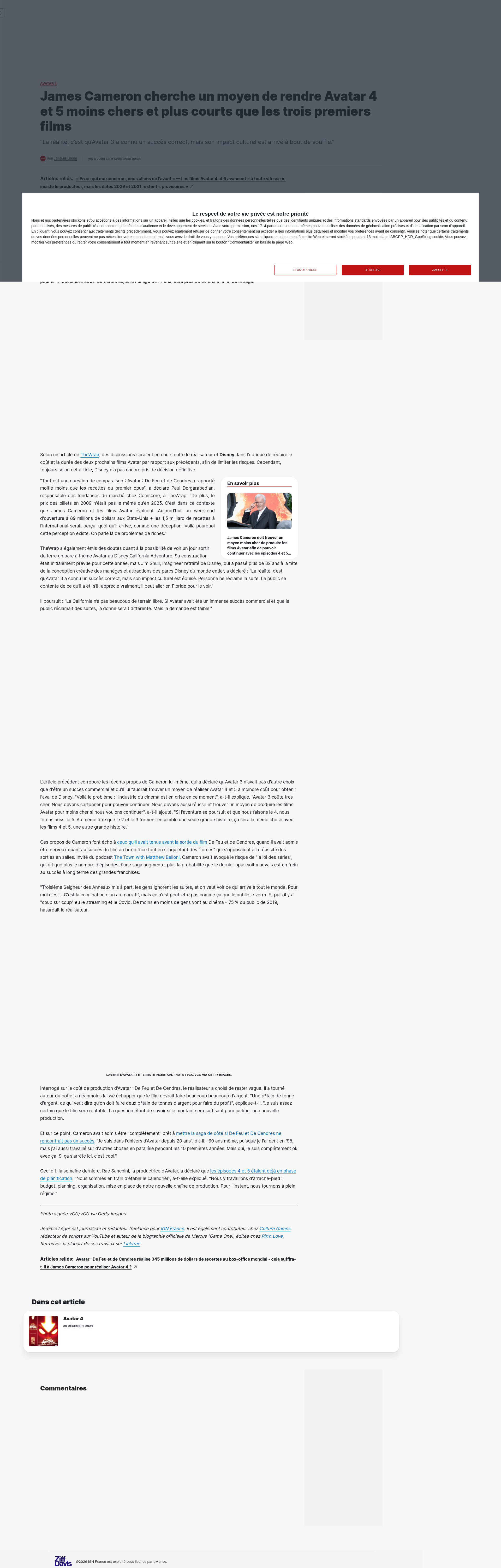 James Cameron cherche un moyen de rendre Avatar 4 et 5 moins chers et plus courts que les trois premiers films"La réalité, c’est qu’Avatar 3 a connu un succès correct, mais son impact culturel est arrivé à bout de souffle."PNGPDF