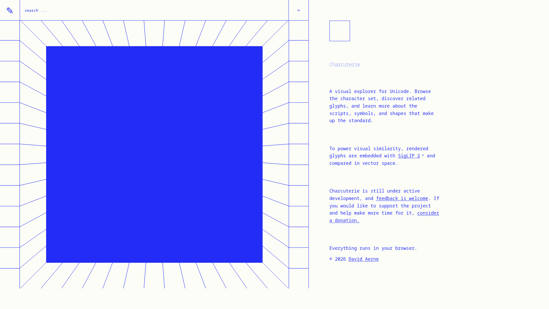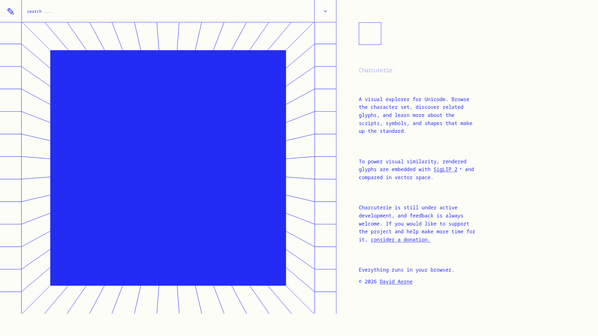 CharcuterieA visual explorer for Unicode. Browse characters, discover related glyphs, and explore scripts, symbols, and shapes across the standard.PNGPDF