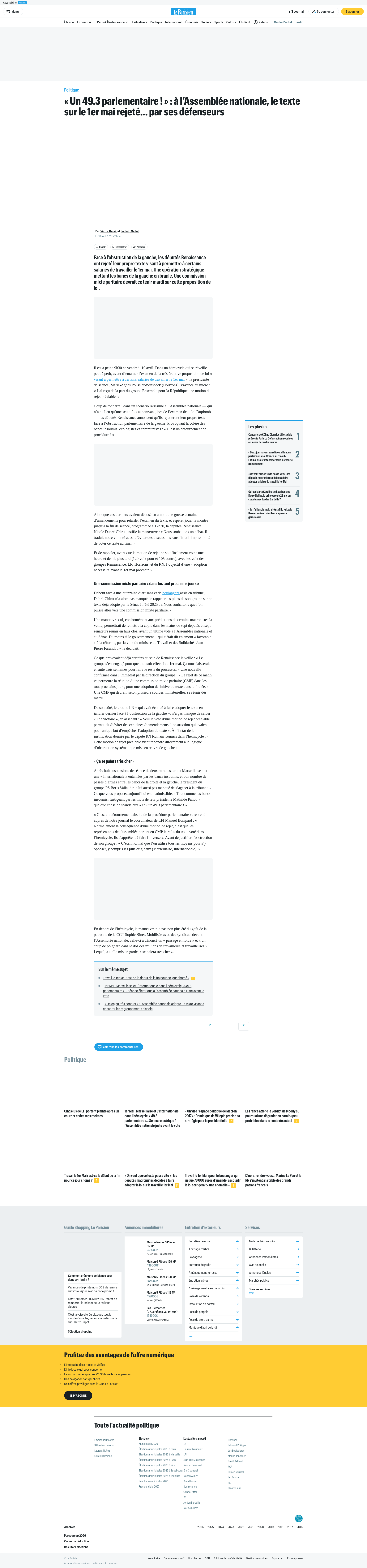« Un 49.3 parlementaire ! » : à l’Assemblée nationale, le texte sur le 1er mai rejeté… par ses défenseursFace à l’obstruction de la gauche, les députés Renaissance ont rejeté leur propre texte visant à permettre à certains salariés de travaillerPNGPDF