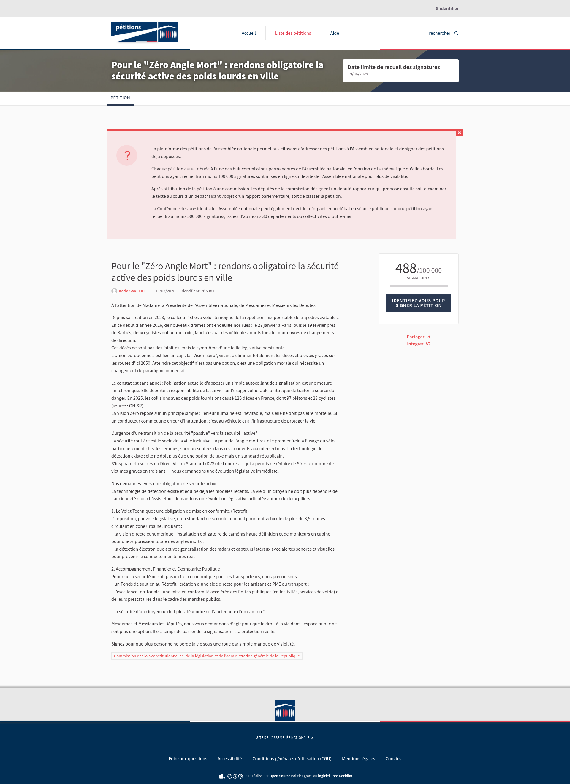 Pour le "Zéro Angle Mort" : rendons obligatoire la sécurité active des poids lourds en ville - Pour le "Zéro Angle Mort" : rendons obligatoire la sécurité active des poids lourds en ville - Plateforme des pétitions de l’Assemblée nationaleÀ l’attention de Madame la Présidente de l’Assemblée nationale, de Mesdames et Messieurs les Députés, Depuis sa création en 2023, le collectif "Elles à vélo" témoigne de la répétition insupportable de tragédies évitables. En ce début d'année 2026, de nouveaux drames ont endeuillé nos rues : le 27 janvier à Paris, puis le 19 février près de Barbès, deux cyclistes ont perdu la vie, fauchées par des véhicules lourds lors de manœuvres de changements de direction. Ces décès ne sont pas des fatalités, mais le symptôme d'une faille législative persistante. L’Union européenne s'est fixé un cap : la "Vision Zéro", visant à éliminer totalement les décès et blessés graves sur les routes d'ici 2050. Atteindre cet objectif n'est pas une option, c'est une obligation morale qui nécessite un changement de paradigme immédiat. Le constat est sans appel : l’obligation actuelle d'apposer un simple autocollant de signalisation est une mesure anachronique. Elle déporte la responsabilité de la survie sur l'usager vulnérable plutôt que de traiter la source du danger. En 2025, les collisions avec des poids lourds ont causé 125 décès en France, dont 97 piétons et 23 cyclistes (source : ONISR). La Vision Zéro repose sur un principe simple : l’erreur humaine est inévitable, mais elle ne doit pas être mortelle. Si un conducteur commet une erreur d'inattention, c'est au véhicule et à l'infrastructure de protéger la vie. L'urgence d'une transition de la sécurité "passive" vers la sécurité "active" : La sécurité routière est le socle de la ville inclusive. La peur de l'angle mort reste le premier frein à l’usage du vélo, particulièrement chez les femmes, surreprésentées dans ces accidents aux intersections. La technologie de détection existe ; elle ne doit plus être une option de luxe mais un standard républicain. S'inspirant du succès du Direct Vision Standard (DVS) de Londres — qui a permis de réduire de 50 % le nombre de victimes graves en trois ans — nous demandons une évolution législative immédiate. Nos demandes : vers unPNGPDF
