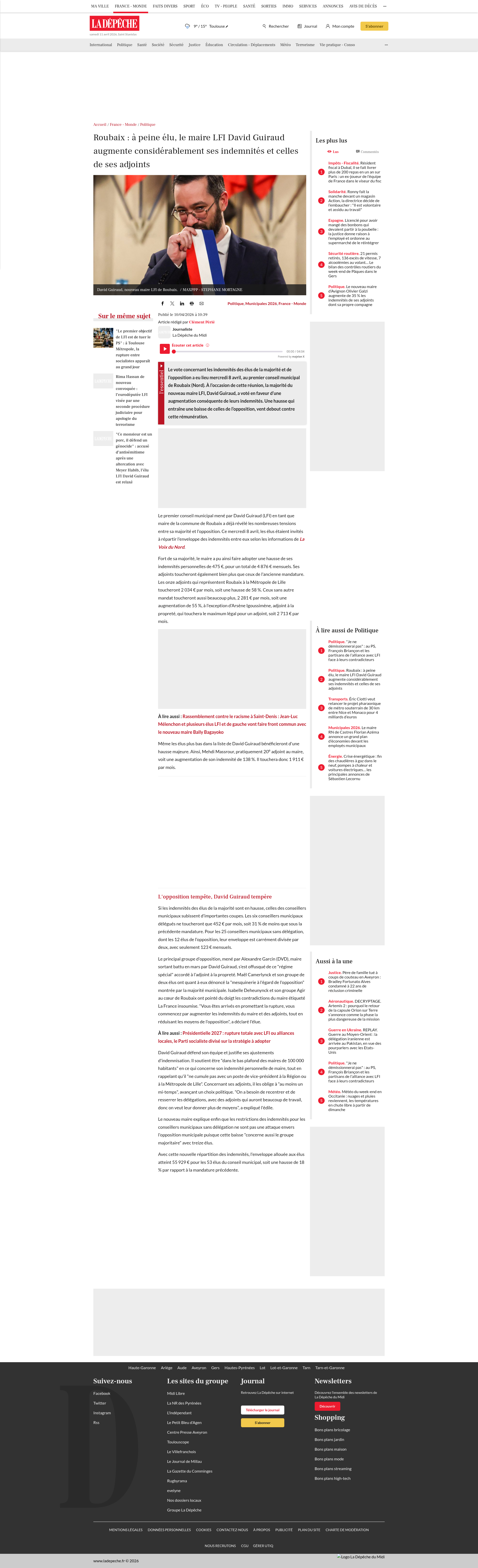 Roubaix : à peine élu, le maire LFI David Guiraud augmente considérablement ses indemnités et celles de ses adjointsLe vote concernant les indemnités des élus de la majorité et de l’opposition a eu lieu mercredi 8 avril, au premier conseil municipal de Roubaix (Nord). À l’occasion de cette réunion, la majorité du nouveau maire LFI,...PNGPDF