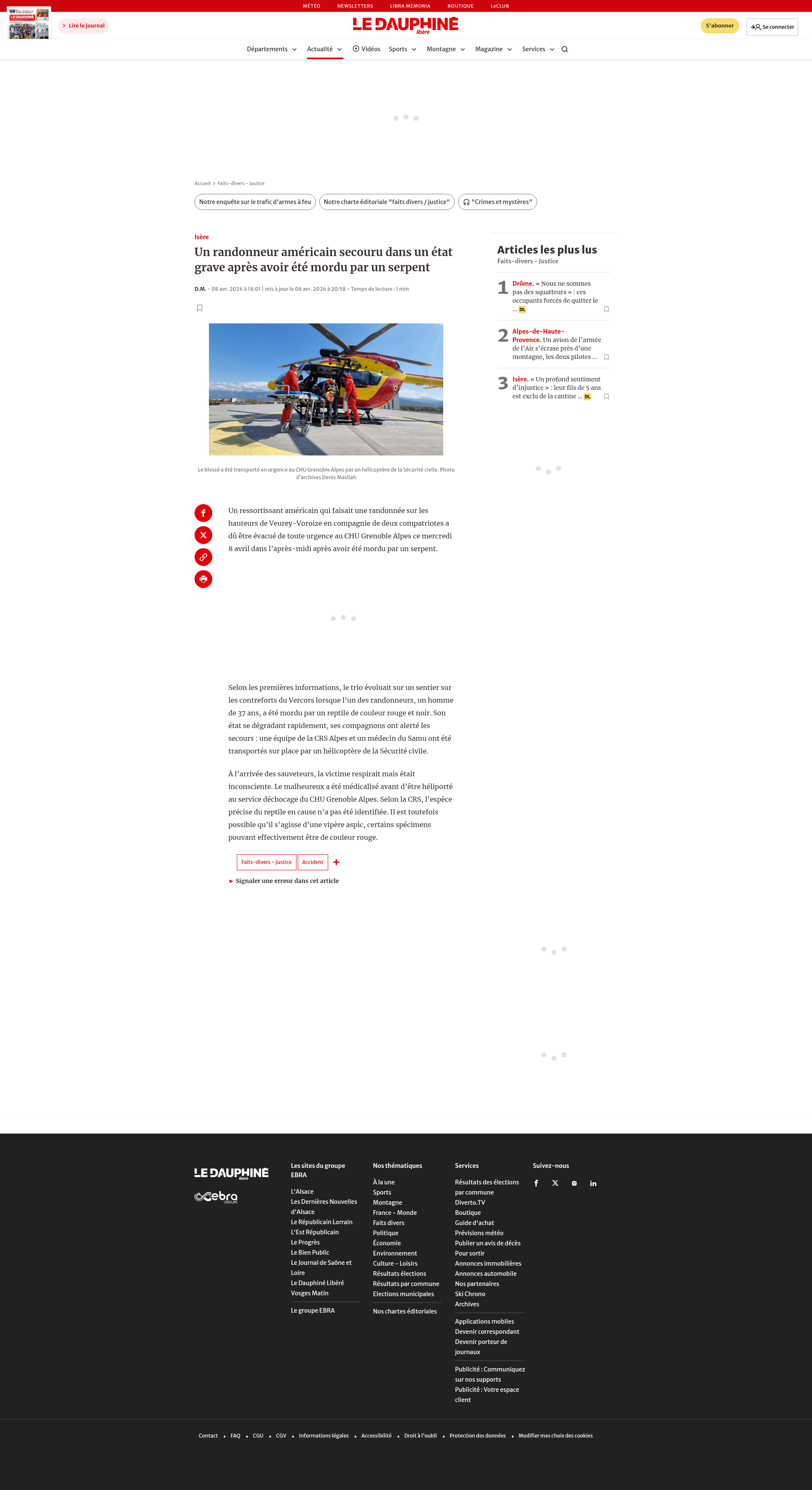 Isère. Un randonneur américain secouru dans un état grave après avoir été mordu par un serpentUn ressortissant américain qui faisait une randonnée à Veurey-Voroize en compagnie de deux compatriotes a dû être évacué après avoir été mordu par un serpent.PNGPDF