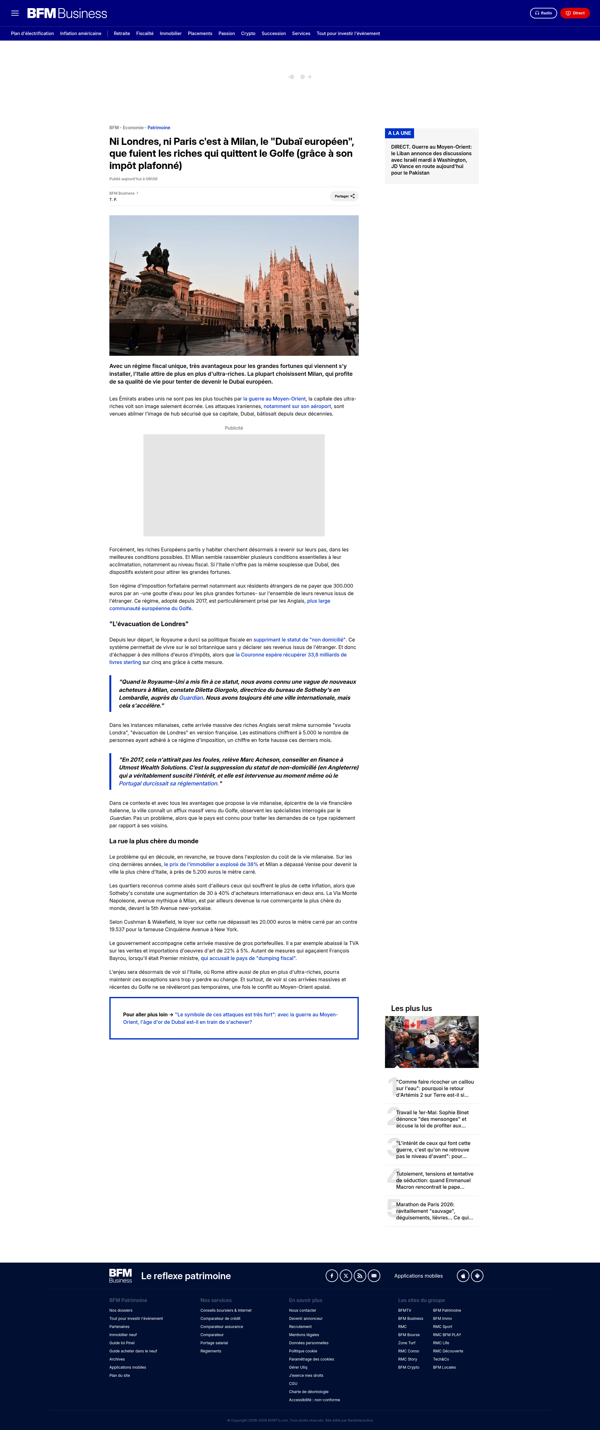Ni Londres, ni Paris c'est à Milan, le "Dubaï européen", que fuient les riches qui quittent le Golfe (grâce à son impôt plafonné)Avec un régime fiscal unique, très avantageux pour les grandes fortunes qui viennent s'y installer, l'Italie attire de plus en plus d'ultra-riches. La plupart choisissent Milan, qui profite de sa qualité de vie pour tenter de devenir le Dubai européen.PNGPDF