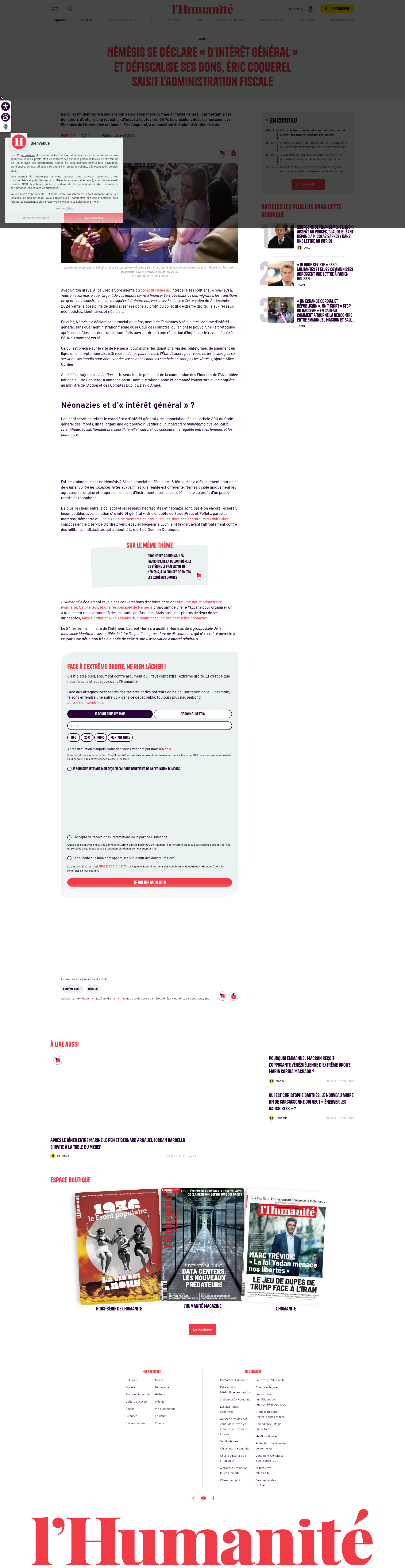 Némésis se déclare « d’intérêt général » et défiscalise ses dons, Éric Coquerel saisit l’administration fiscale - L'Humanité Le collectif identitaire a déclaré son association mère comme d’intérêt général, permettant à ses donateurs d’obtenir une réduction d’impôt à hauteur de 66 %. Le présid...PNGPDF