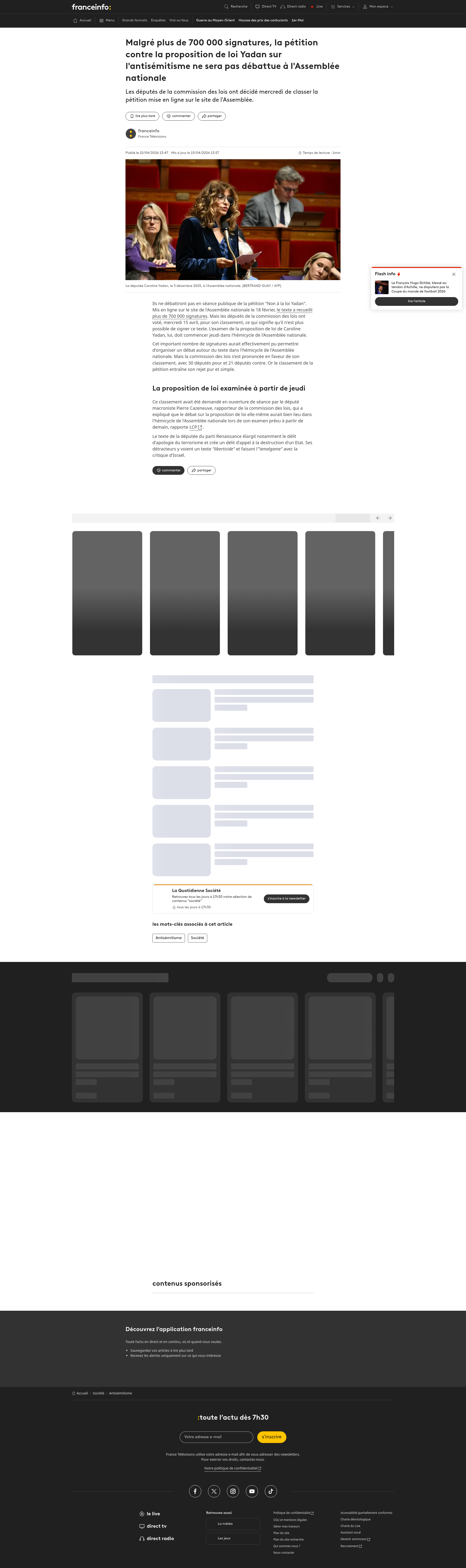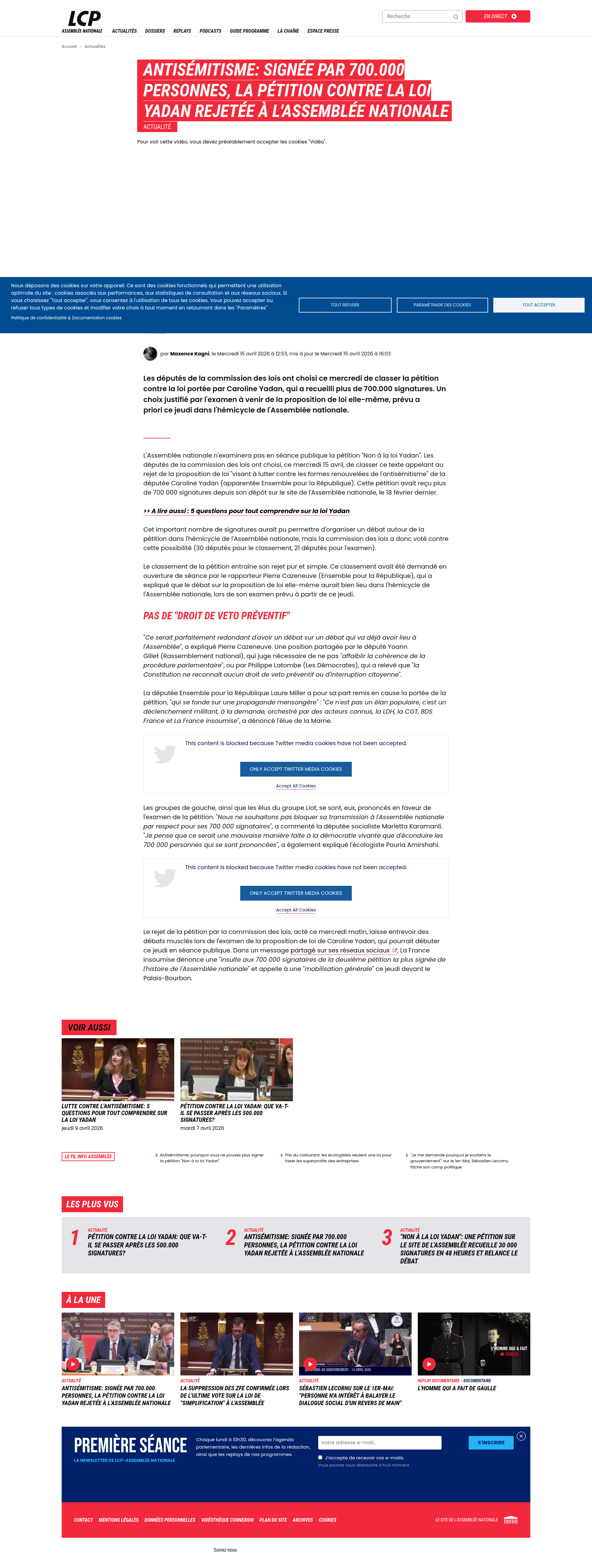 Antisémitisme: signée par 700.000 personnes, la pétition contre la loi Yadan rejetée à l'Assemblée nationale | LCP - Assemblée nationaleLes députés de la commission des lois ont choisi ce mercredi de classer la pétition contre la loi portée par Caroline Yadan, qui a recueilli plus de 700.000 signatures. Un choix justifié par l'examen à venir de la proposition de loi elle-même, prévu a priori ce jeudi dans l'hémicycle de l'Assemblée nationale.PNGPDF
