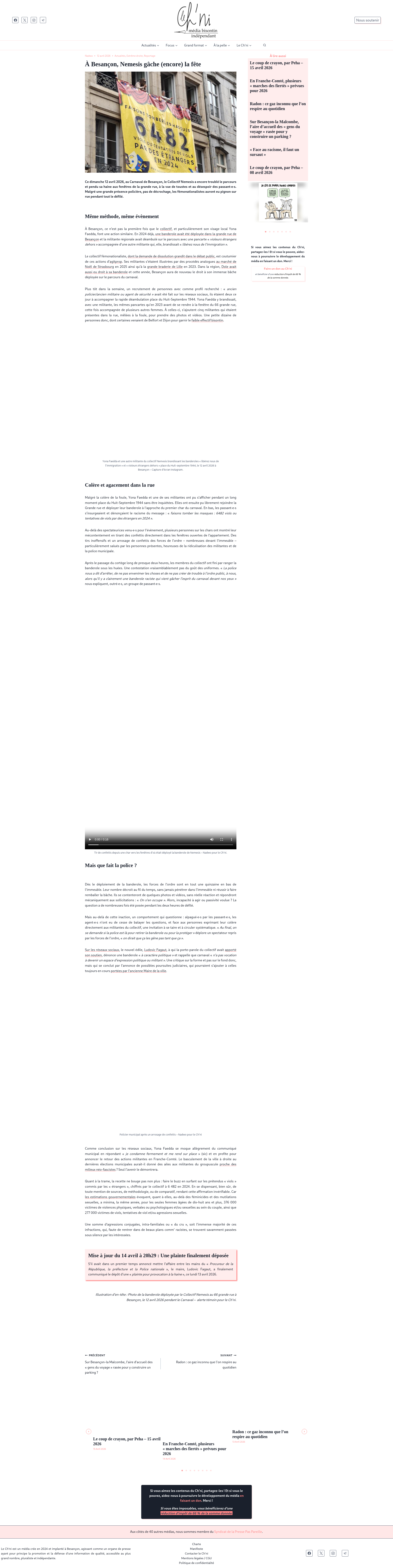 À Besançon, Nemesis gâche (encore) la fête - Le Ch'niCe dimanche 12 avril 2026, au Carnaval de Besançon, le Collectif Nemesis a encore troublé le parcours et pendu sa haine aux fenêtres de la grande rue,...PNGPDF