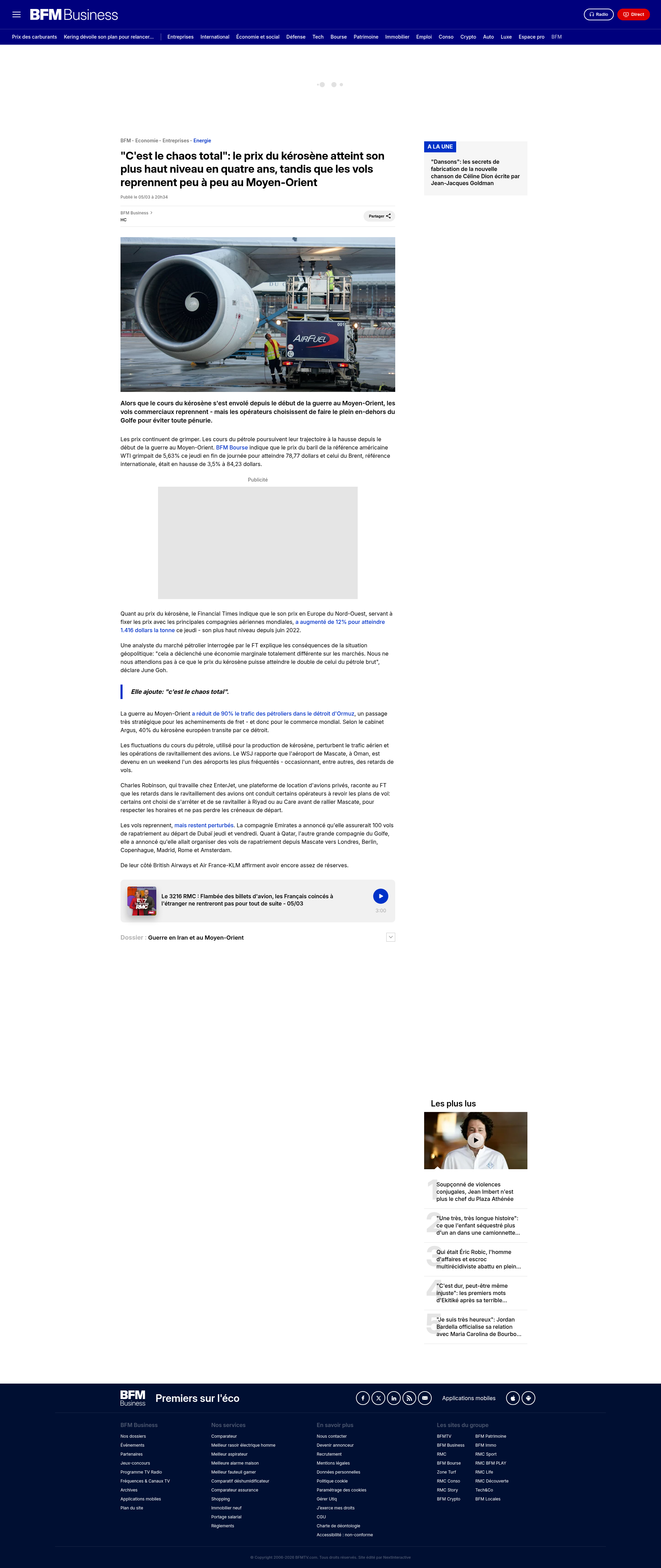 "C'est le chaos total": le prix du kérosène atteint son plus haut niveau en quatre ans, tandis que les vols reprennent peu à peu au Moyen-OrientAlors que le cours du kérosène s'est envolé depuis le début de la guerre au Moyen-Orient, les vols commerciaux reprennent - mais les opérateurs choisissent de faire le plein en-dehors du Golfe pour éviter toute pénurie.PNGPDF
