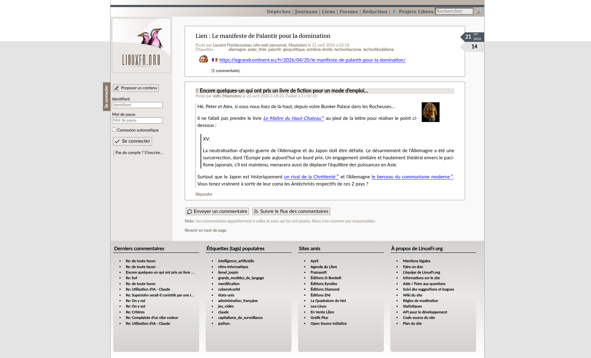 D'une blague sur LinuxFr.org à l'écriture d'un roman de SF - LinuxFr.orgL’actualité du logiciel libre et des sujets voisins (DIY, Open Hardware, Open Data, les Communs, etc.), sur un site francophone contributif géré par une équipe bénévole par et pour des libristes enthousiastesPNGPDF