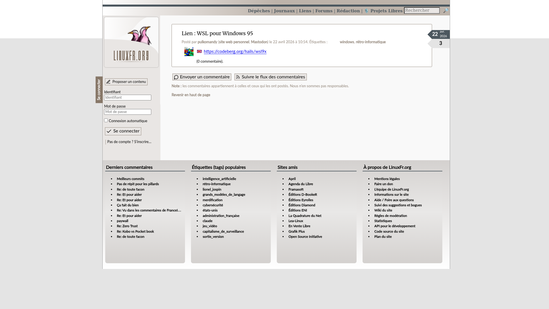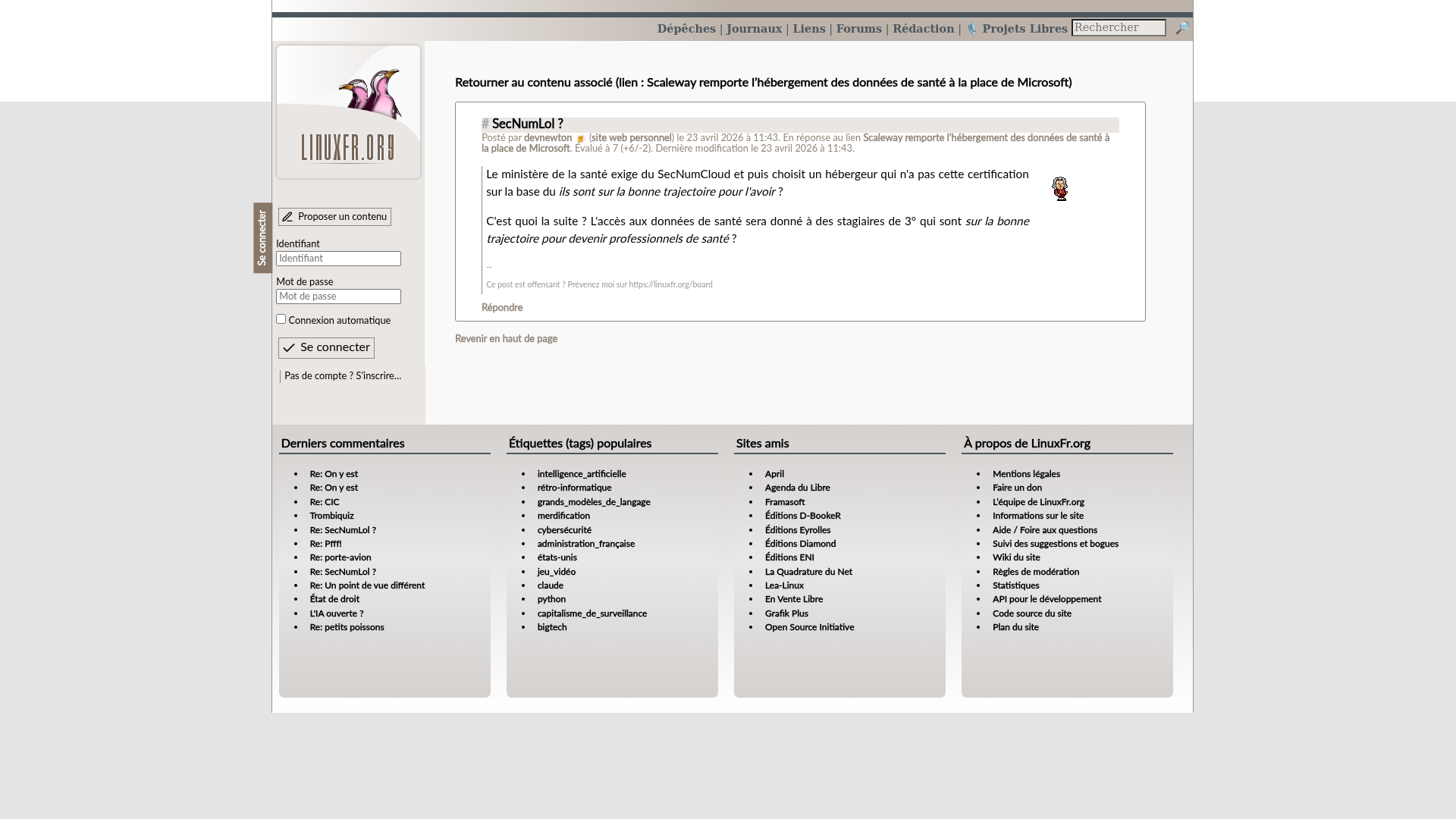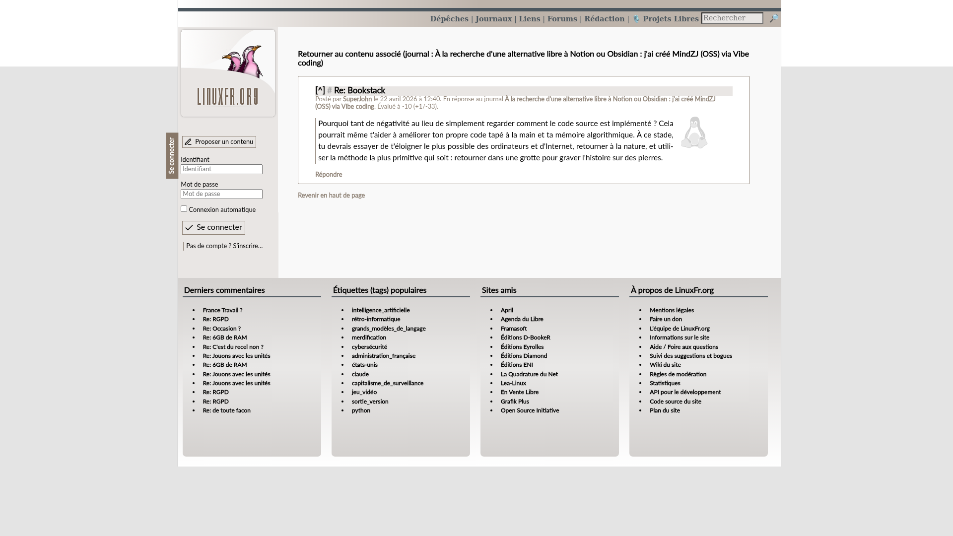 Re: Titre - LinuxFr.orgL’actualité du logiciel libre et des sujets voisins (DIY, Open Hardware, Open Data, les Communs, etc.), sur un site francophone contributif géré par une équipe bénévole par et pour des libristes enthousiastesPNGPDF